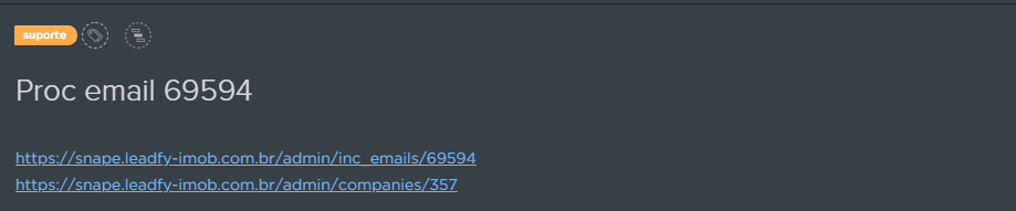 Obs: Seguir o padrão de Card igual a imagem, onde o número na frente do “Proc email” é o ID do email de Lead e os Links são os da Company do cliente e do email a ser processado: Auth Incmail Link_Email_Body